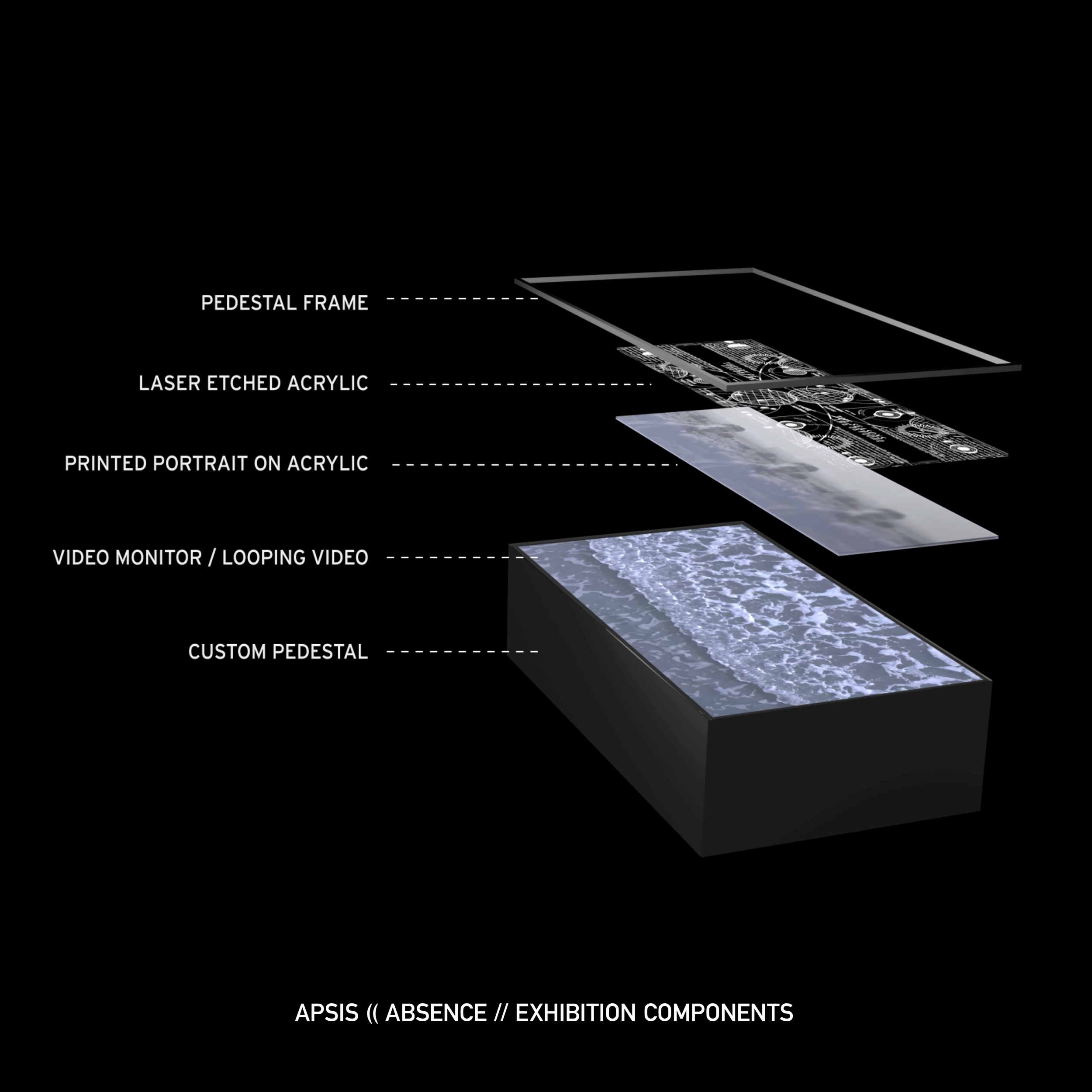 APSIS (( ABSENCE represents the continuation of efforts to visualize and express themes of time, loss, metaphysical borders, and the fragility of memory. Within the installation, a fading triptych portrait is combined with looping, projected videos of ocean tides and lunar phases.